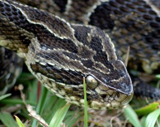 The lancet shaped head of the Jacaral. With its golden eyes that can only detect the warmth of object in its environment.