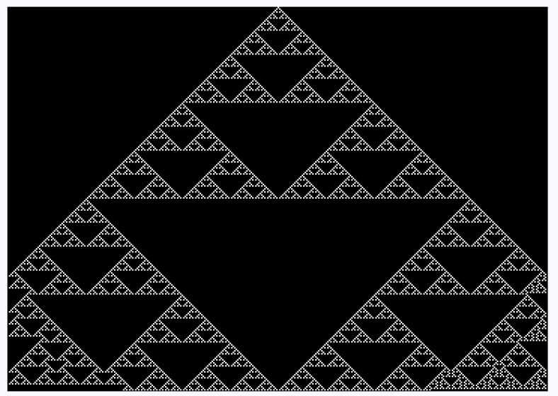The odd numbers in Pascal’s Triangle form a pattern identical to the Sierpinski Gasket. This is because the XOR operation in the cellular automaton mirrors the same process of adding and reducing modulo 2. Each cell in the automaton corresponds to whether a number in Pascal’s Triangle is odd (1) or even (0).