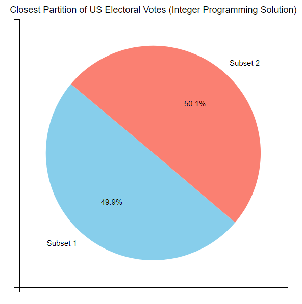 Using the ILP formulation above, we can test the partitioning of the electoral votes. If an equal partition exists, it indicates a potential scenario for a tied election. Otherwise, the ILP will maximize the minimum subset sum, showing the closest achievable balance.