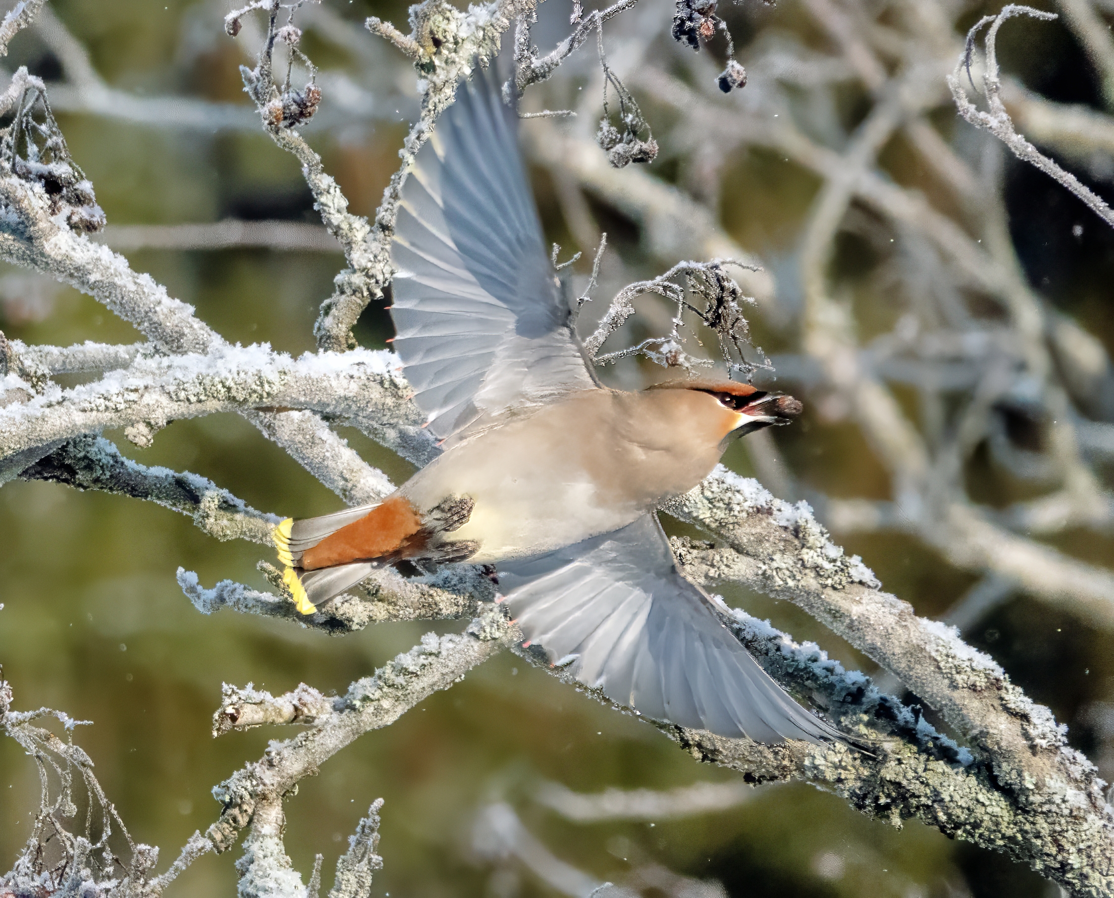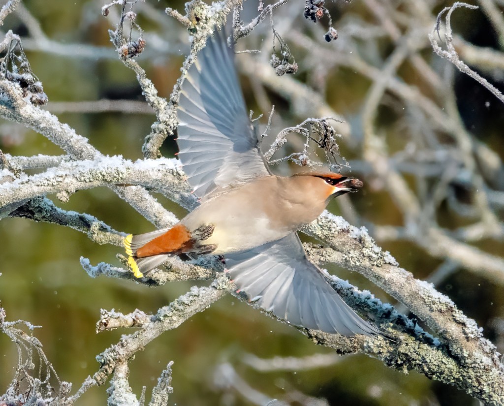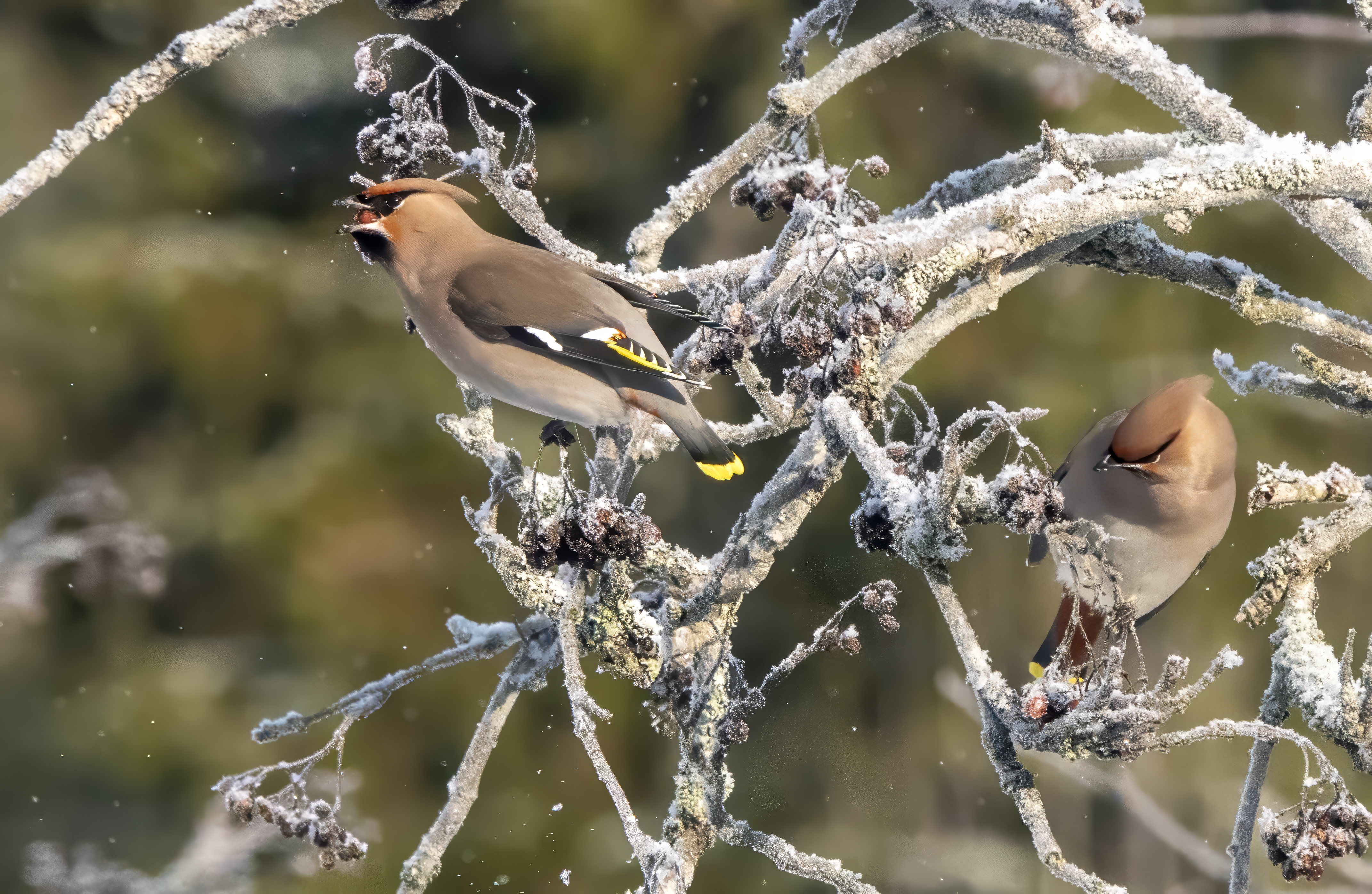 Date taken: February 15th 2025, Place: Keltinmäki, Jyväskylä, Central Finland, ca. 10am. I used a Sony RX10 M4 with a 600 mm lens, a shutter speed of 1/3000 s, an aperture of f/7.1, and ISO 1000. The tilhet (waxwings) had gathered in a large swarm on a tall spruce, from which smaller flocks descended toward the rowanberry trees. I was hidden in a narrow street tunnel, and the angle of the sun was perfect for capturing the vivid colors of these beautiful birds. With an outside temperature of -19°C, I had to choose between taking more photos or keeping my hands warm by tucking them deeper into my gloves.