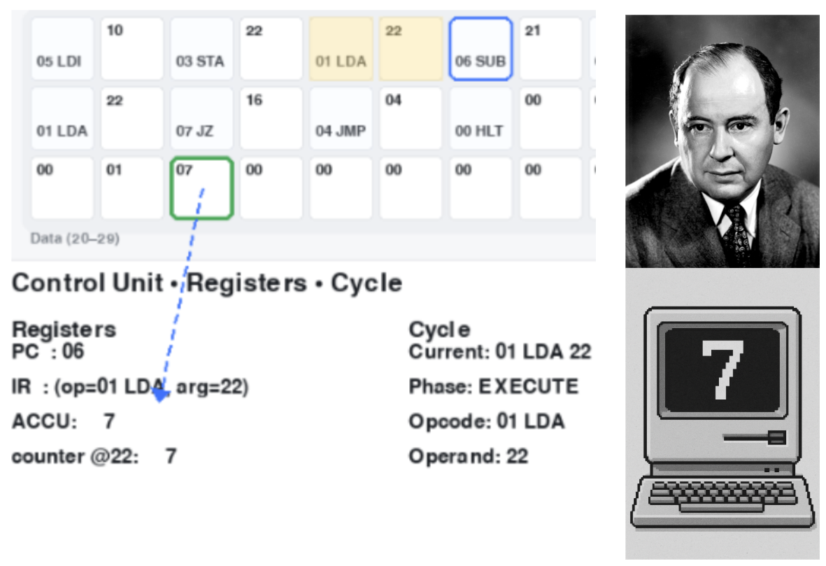 This interactive mini-simulation shows a stored-program computer in the classic von Neumann style executing a tiny machine-code program that counts down from 10 to 0. You can watch the registers and memory interact during the fetch–decode–execute cycle. It’s a compact demonstration of the model that underlies almost all modern computing—right up to the CPUs and GPUs that run today’s AI systems.