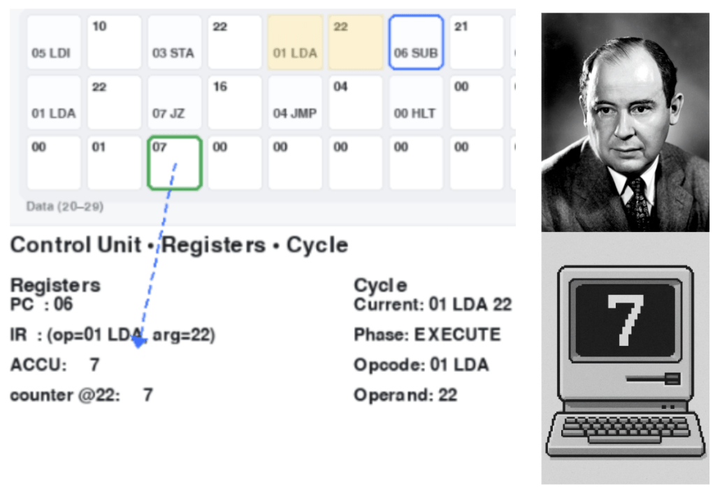 This simple loop is representative of how real processors run every program: a stream of numeric opcodes acting on data in memory. Modern AI workloads (from Python frameworks to CUDA kernels) are ultimately translated into such instruction streams for CPUs/GPUs that still follow the same stored-program principle—albeit with many layers of caching, pipelining, and parallelism.