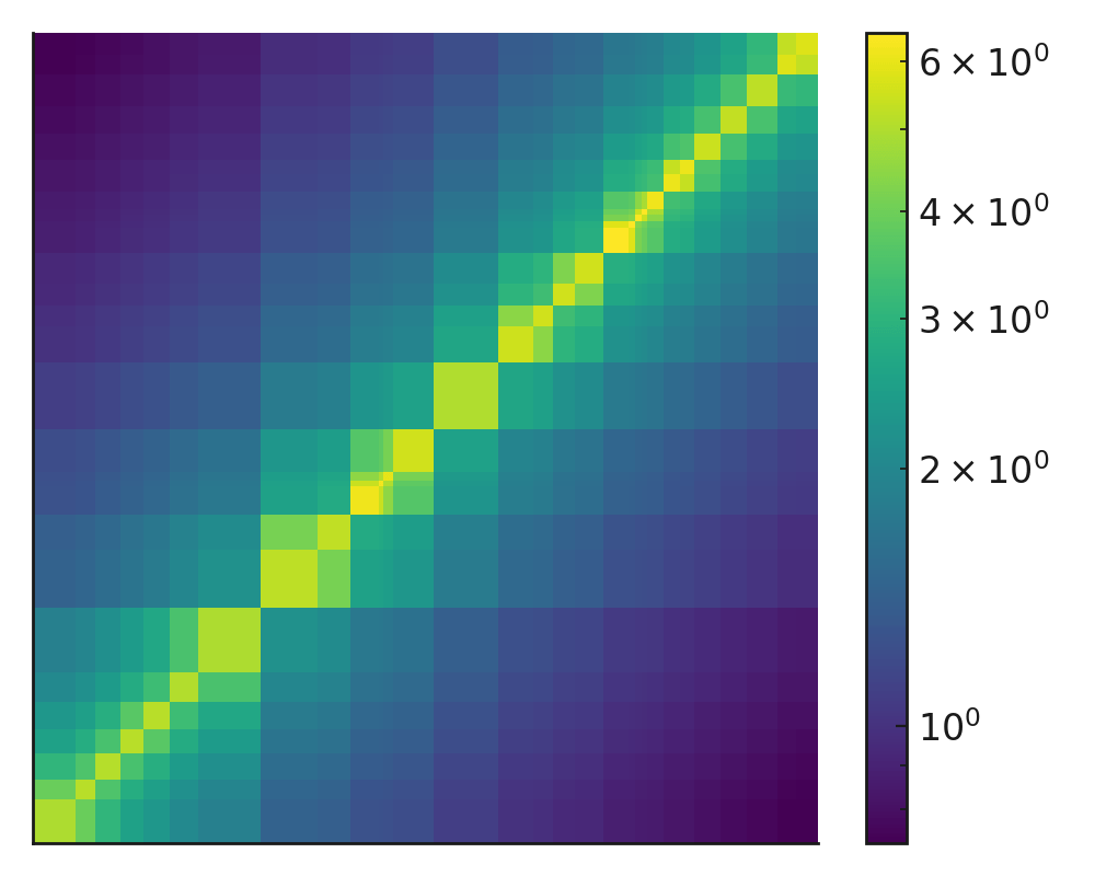 Figure: Logarithmically scaled Riesz interaction matrix for a random set of 30 points on the unit interval,