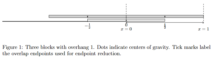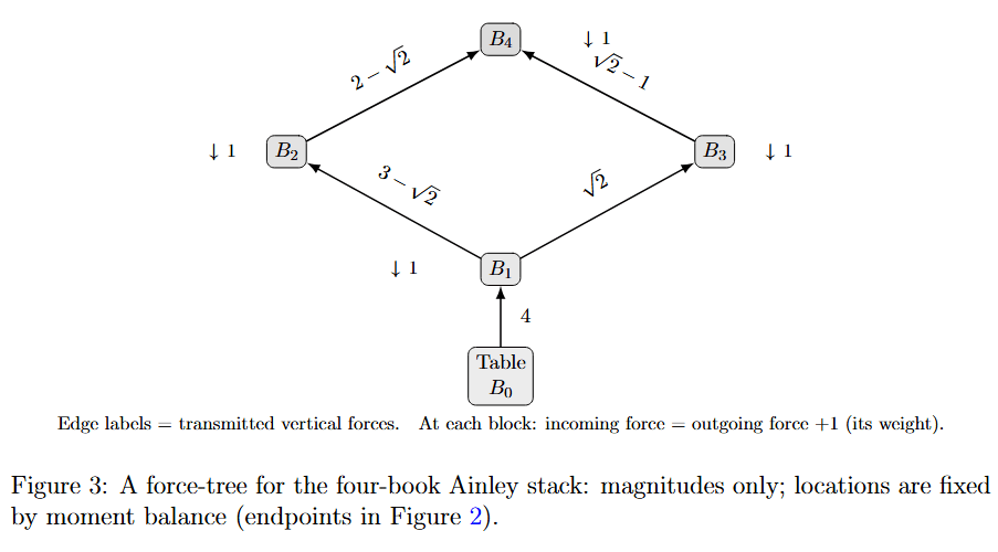 The configurations above are balanced: they satisfy equilibrium with nonnegative vertical reactions. Some are critical in the sense that forces concentrate at endpoints. A physical stack may need a tiny perturbation or a touch of friction to be robustly stable; this distinction is discussed in [2].