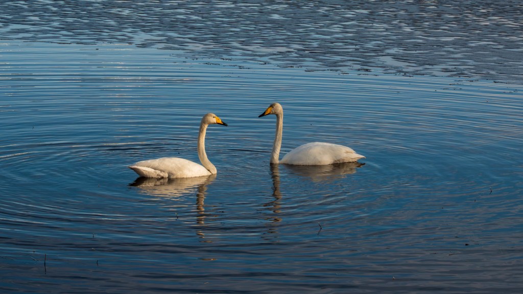 On a calm Good Friday afternoon in early April, the wild swans (Cygnus cygnus) had returned to Lake Jyväsjärvi. They find shelter in the reedbeds along the eastern shore and forage along the bottom of the shallow waters in the little bays, always together as a pair in this season. Swans mate for life.