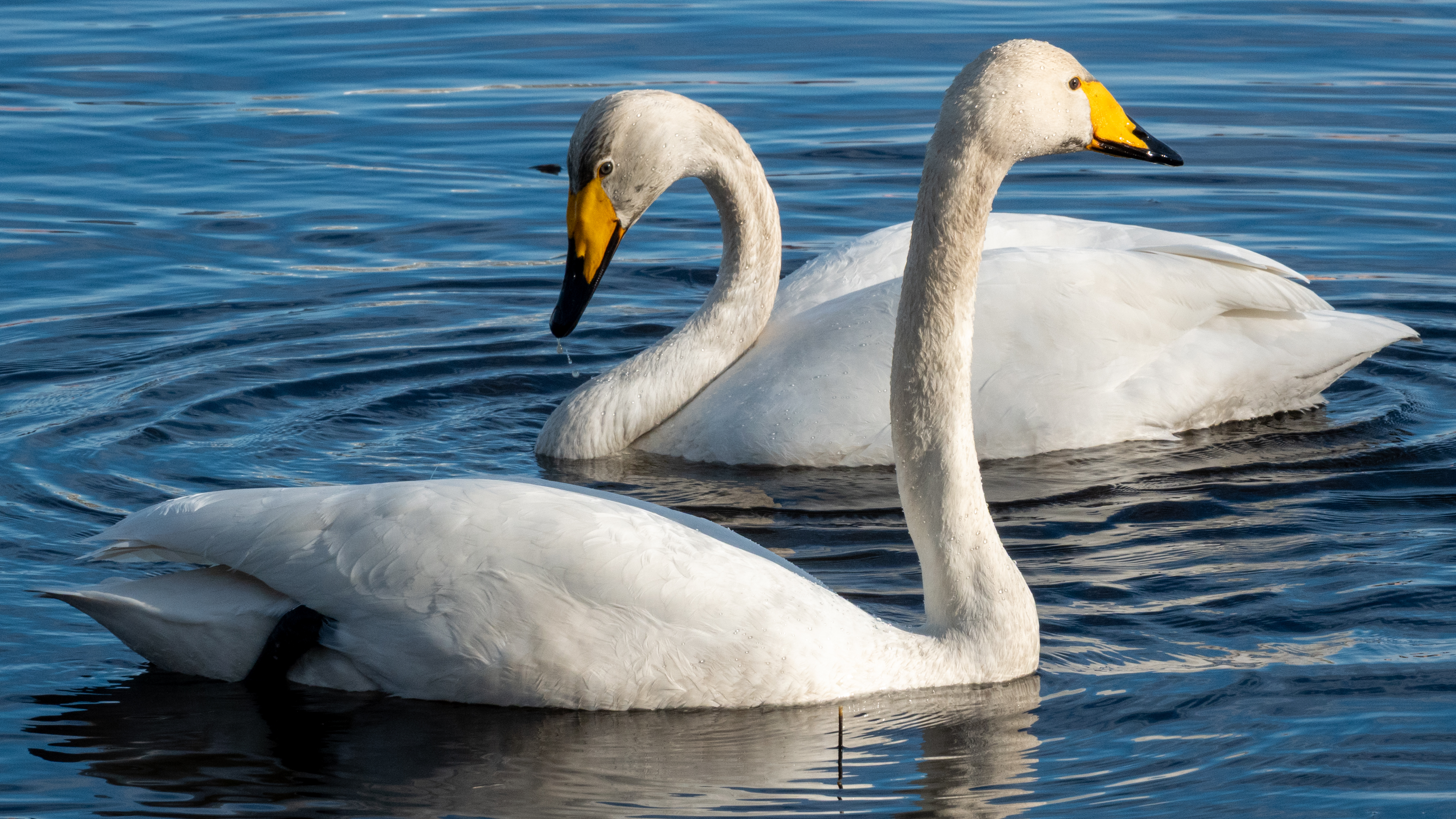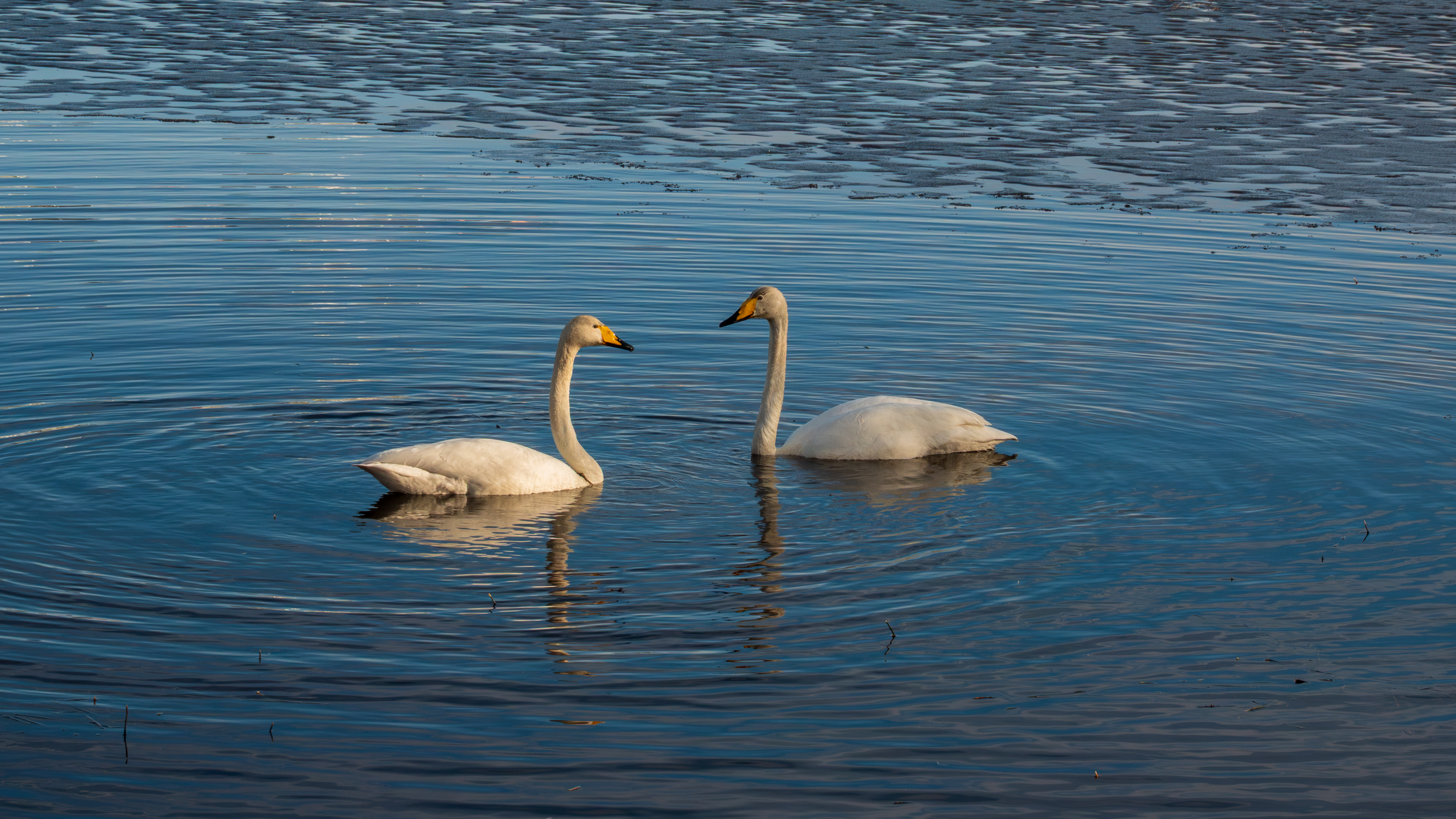 I spotted them while cycling along the Rantaraitta trail around the lake. In the melted part of the otherwise still frozen lake, they were dipping beneath the water in search of food. I took the landscape photograph from the birdwatching hut, while the swans were in another bay of the half-thawed lake, roughly in the upper-left part of the image. The swan photo was taken with a Sony RX10 M4 camera at a fast shutter speed of 1/1000 s, since the sunlight made it challenging not to overexpose their white plumage. My aim was to capture both the atmosphere of the melting lake and the two swans as a couple from different distances and perspectives.